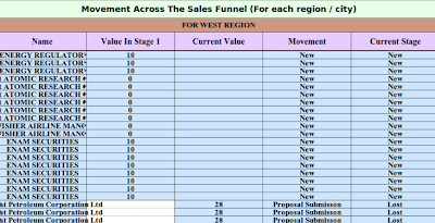 5.Movement across the Sales funnel ( for each region / city) – Each Lead is Analysed in detail here on value and movement. Focus is on each individual lead.
