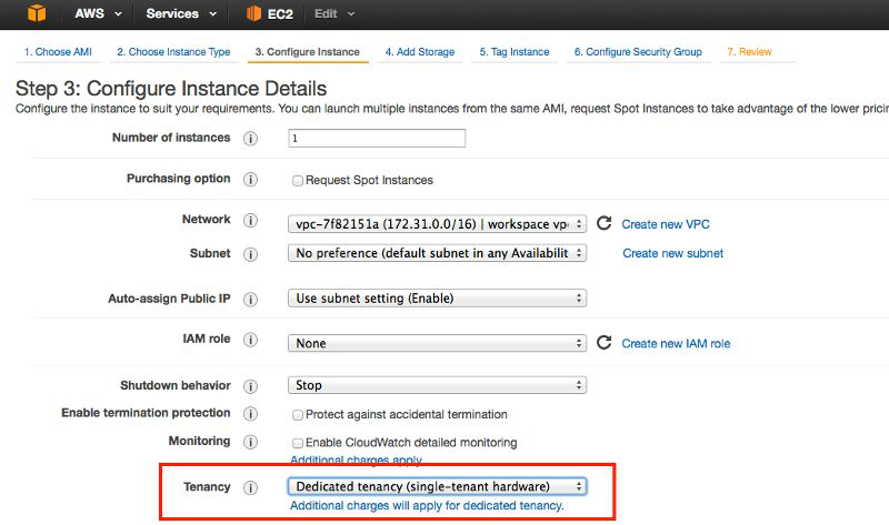 First, you must be sure that your EC2 instance is running on hardware that is dedicated to a single customer by using a dedicated instance. You can do this by setting the tenancy attribute to “dedicated” on either the Amazon VPC that the instance is launched in, the Auto-Scaling Launch Configuration, or on the instance itself, as shown in the following screenshot.