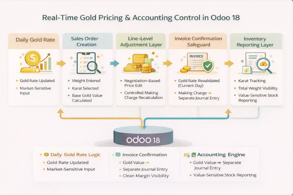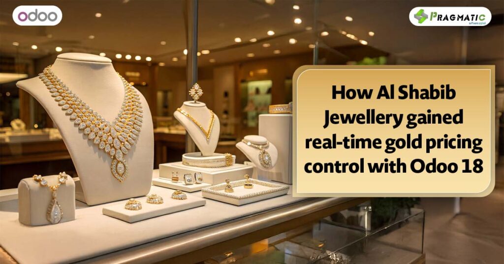 The implementation was built on Odoo 18, powered by Pragmatic’s Jewellery Management module and enhanced with custom pricing and accounting logic tailored to gold-rate-sensitive retail operations.