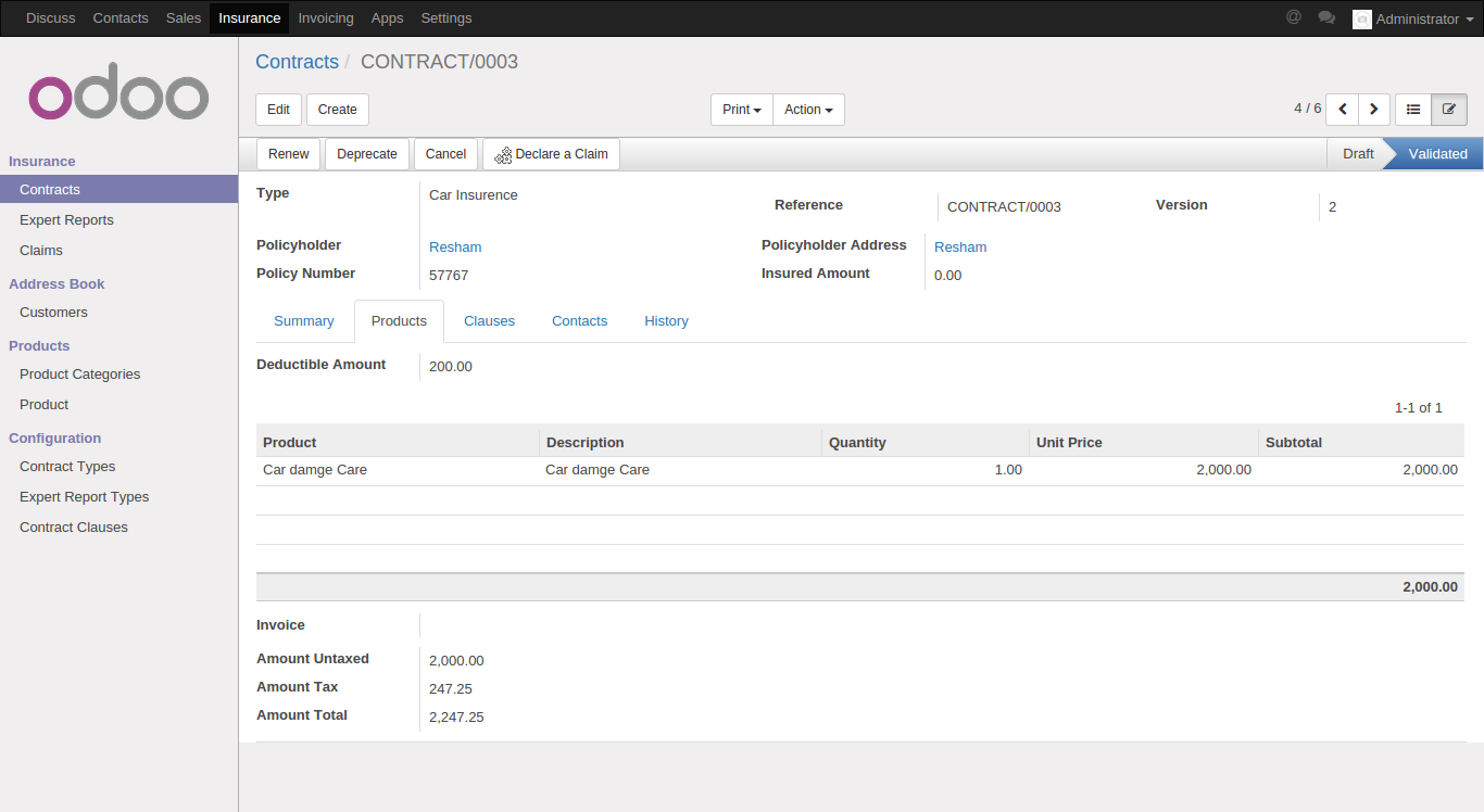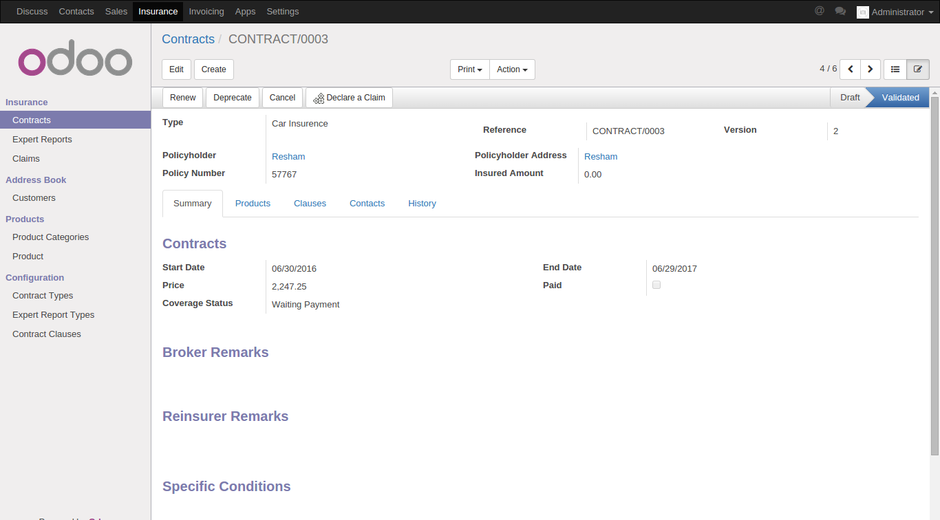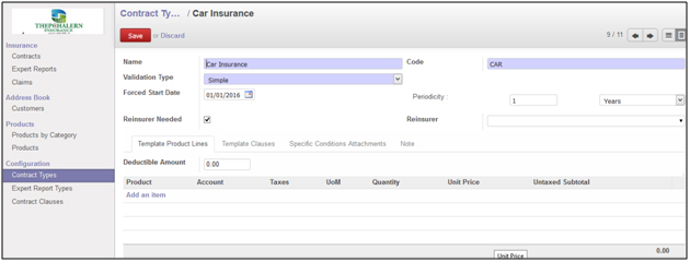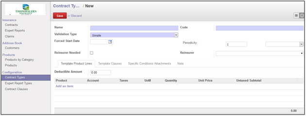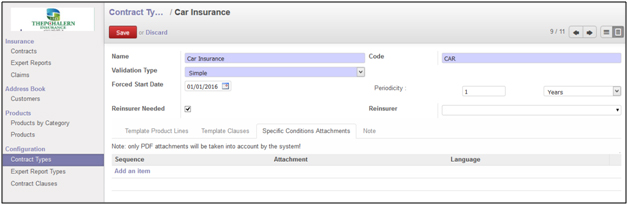 User can define the type of contracts which are present in company. This will include following:- Template product line, Template clauses, Specific Condition Attachment & Notes.