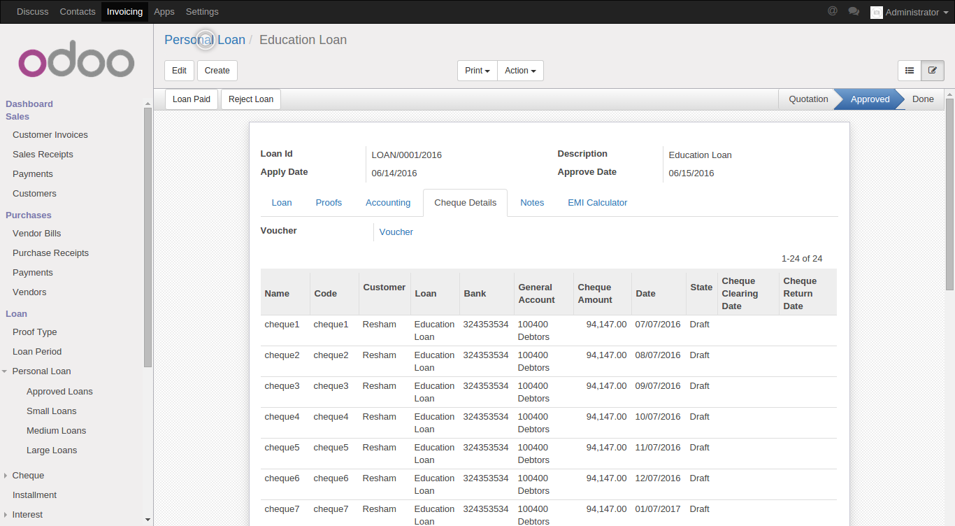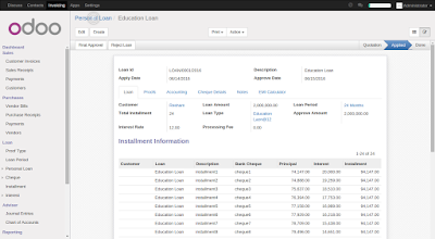 As name suggest, loan management module is blend of all important functionalities like manage different type of loan, different calculation mode, borrowed & issued loans, loans with installment repayments with accounting entry, annuity repayment, possibilities for entering special repayments and many more options with it.