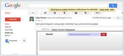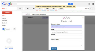 Pragmatic has created the much required automation and seamless integration of Odoo with Gmail Plugin/ extension. We had used the Gmail Contextual Gadget to integrate with Odoo and create Leads/ Contacts/ Customers/ Support Tickets and much more at just a click of a button.