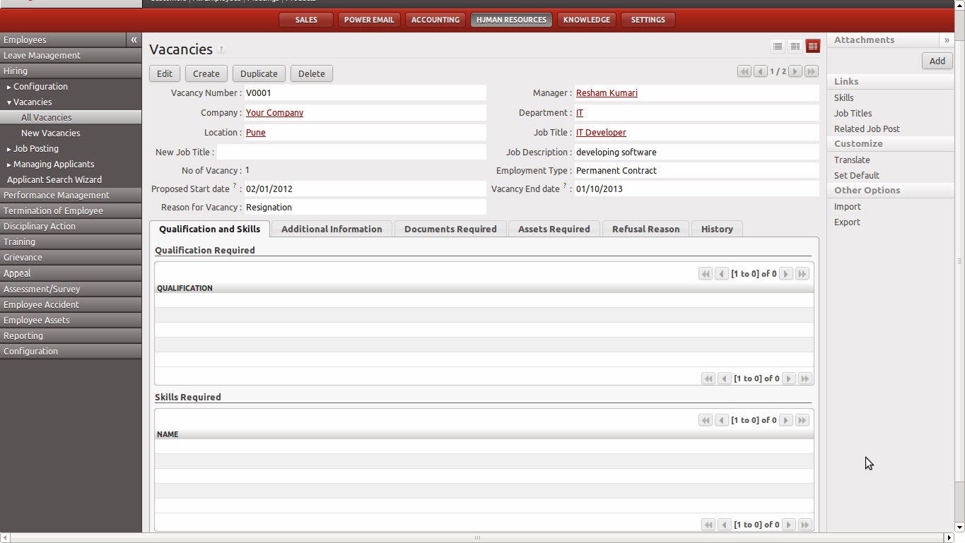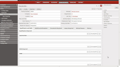 The manager creates a vacancy in the system. The vacancy contains details like – No. of Vacancy , Reason for vacancy , Location , Department , skill set required , qualification required etc.