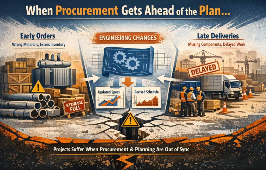 If engineering changes are not reflected in procurement timelines, materials may be ordered too early or too late. Early deliveries result in inventory and storage challenges, while late deliveries directly delay execution.