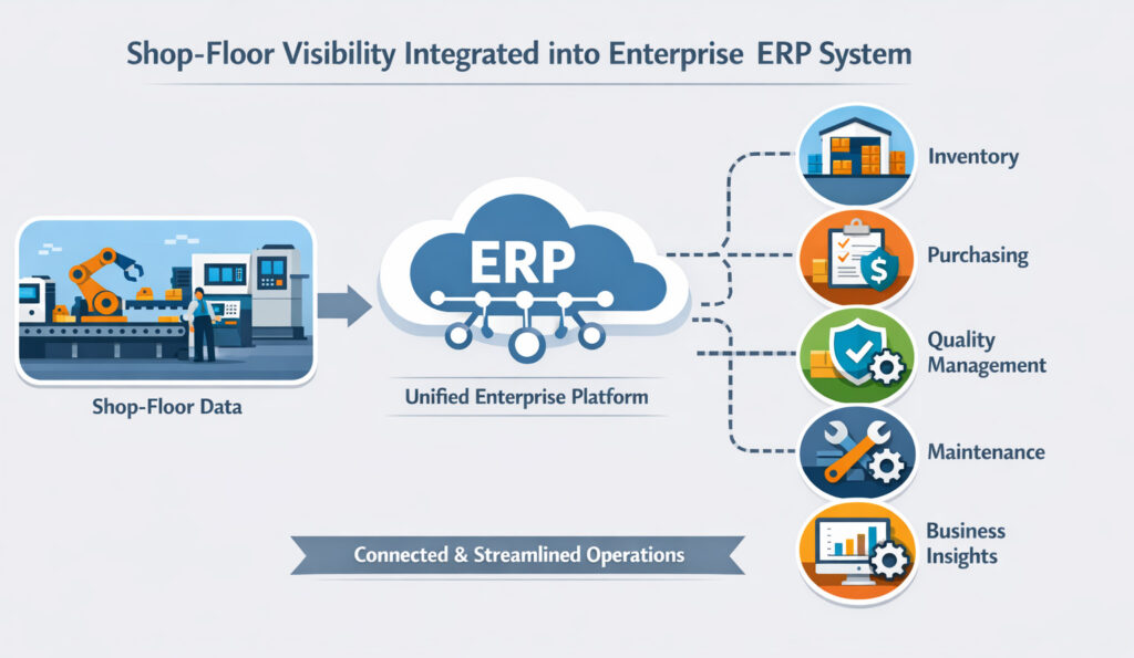 Digital shop-floor visibility is rarely achieved through standalone systems alone. Instead, the most successful implementations integrate shop-floor data into a broader enterprise platform.