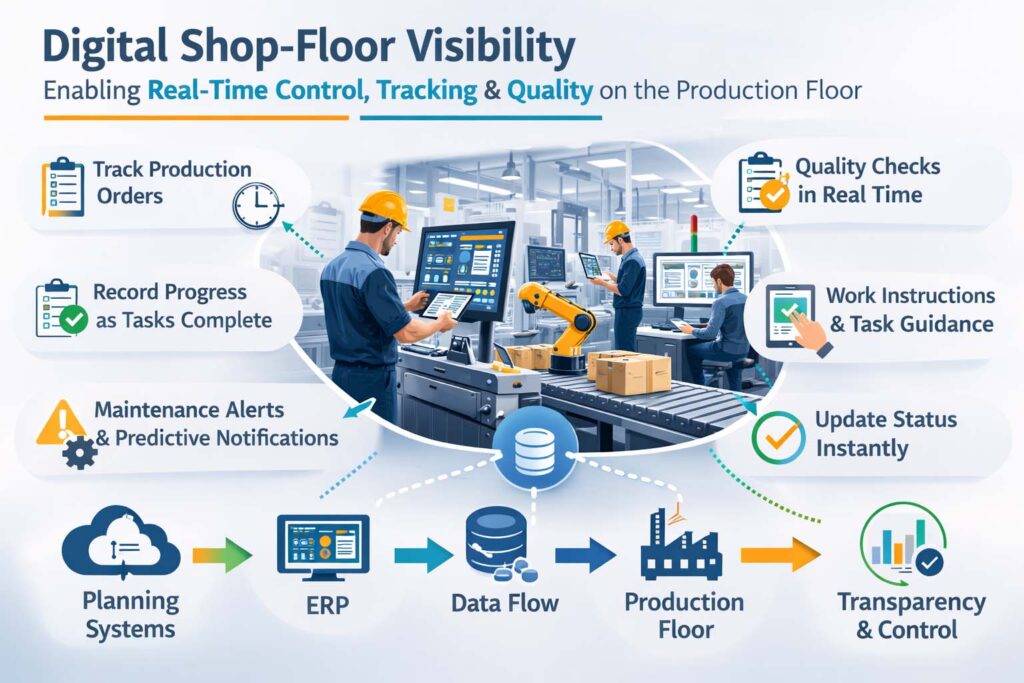 Shop-floor visibility refers to the ability to monitor production activities, work orders, machine performance, and operator tasks in real time. This visibility enables faster decision-making and improves coordination between production, planning, and management teams.