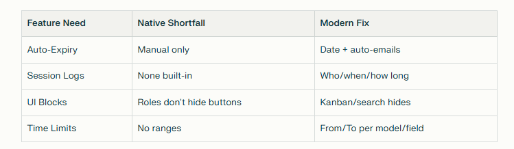 Odoo’s native roles answer “Who can access what?” well. But they falter on :